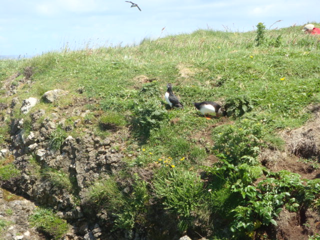 小高い丘のようなところを、👉の標識に沿って上がっていきますと、いたいた、パフィンだあ。いっ〜っぱいいます。