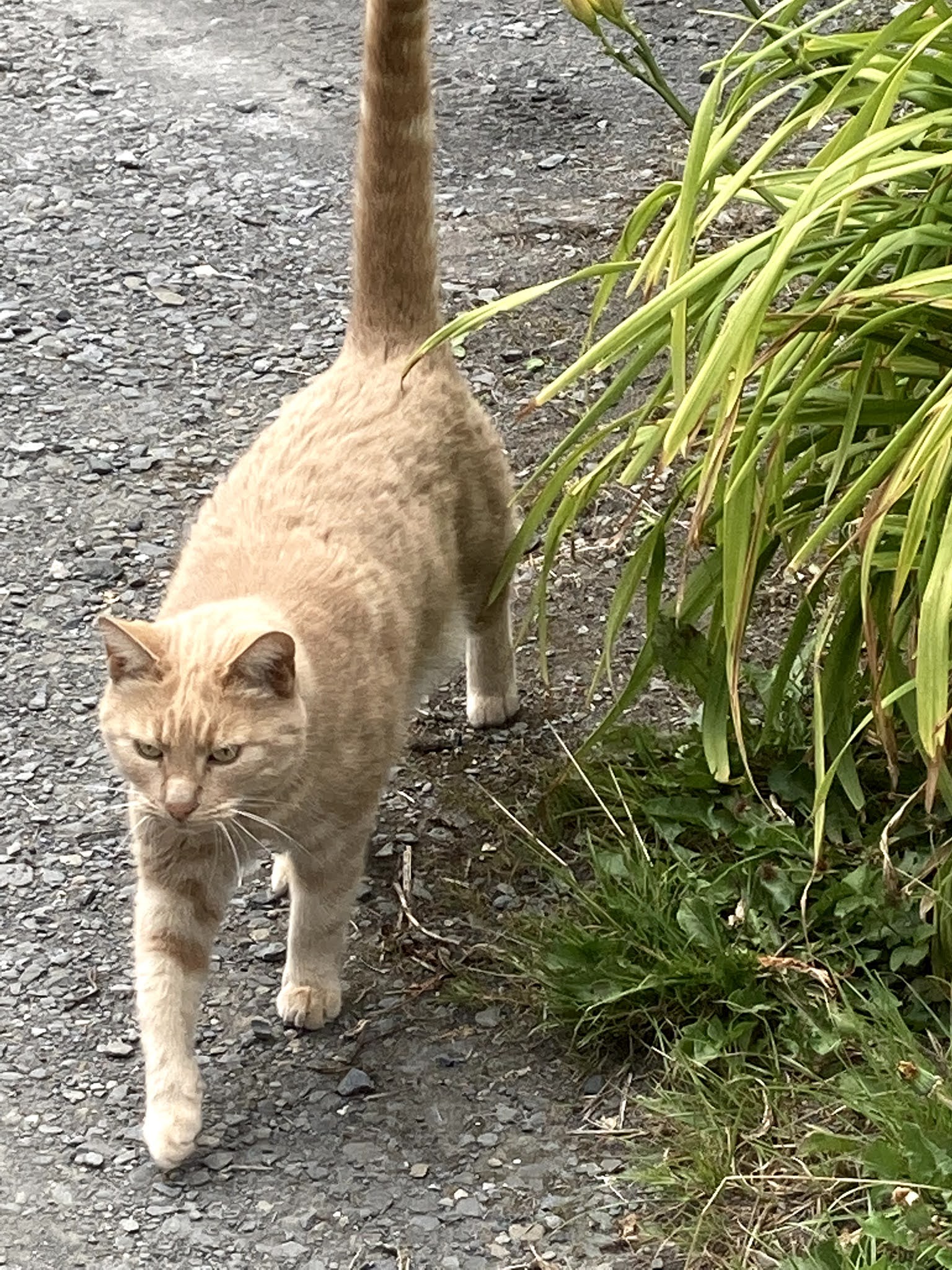 昼寝してたジンジャーな猫が降りてきて、人懐こいです。