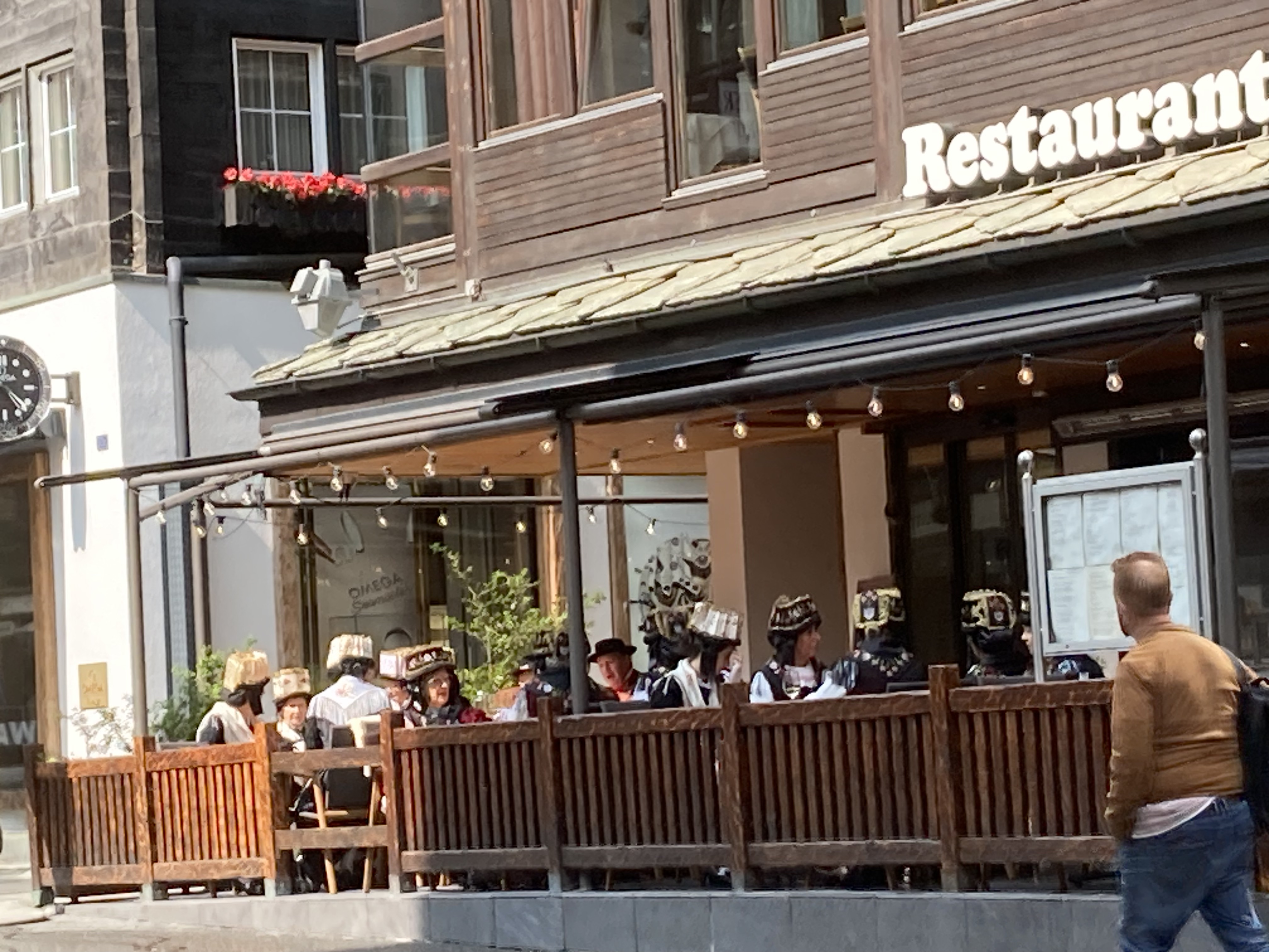 何かのイベントなのか、チロル風の民族衣装に身を包んだちょっと歳増しのハイジたちがやってきました。のちにパブのテラスにも溜まってました。