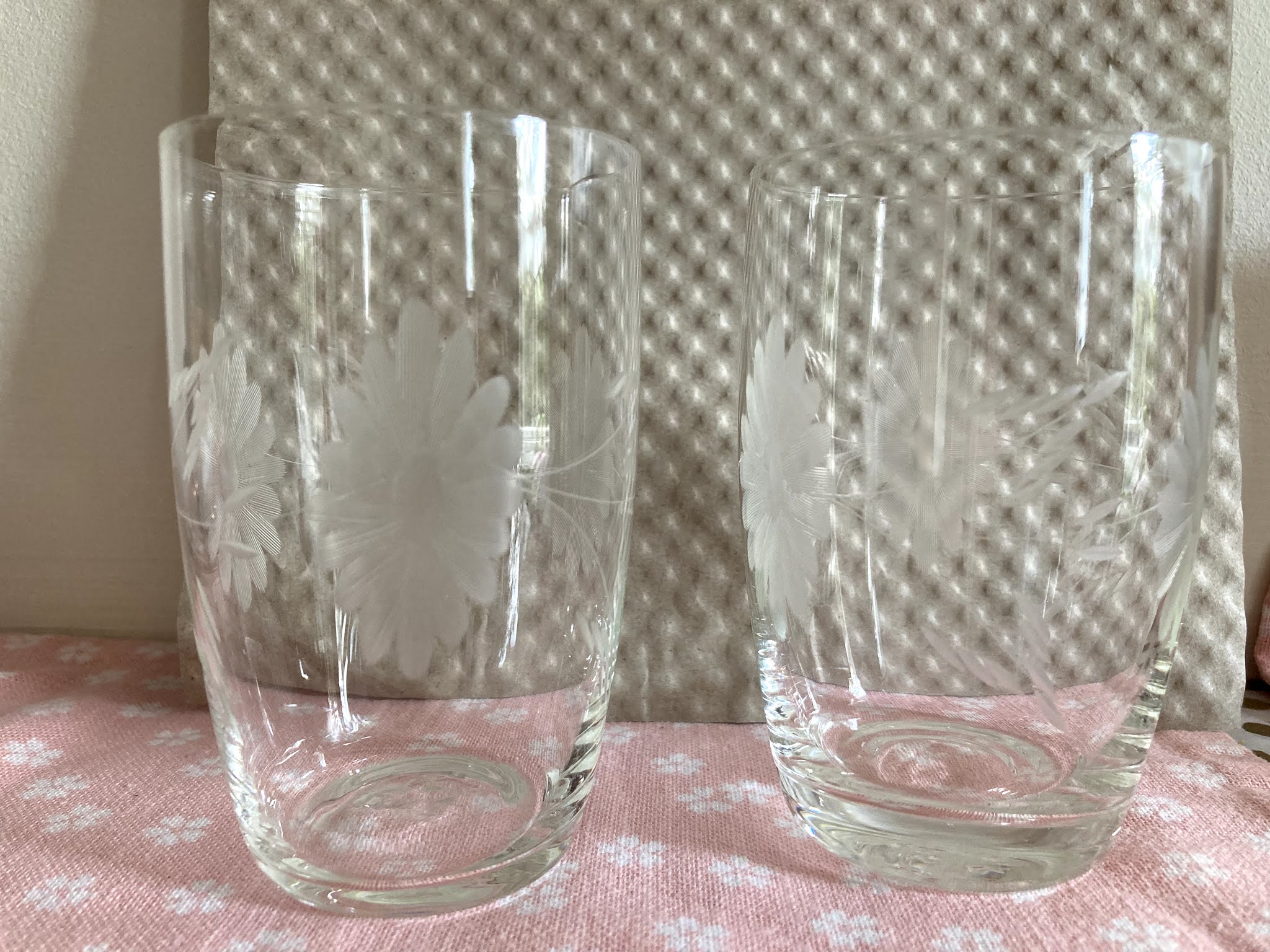 昔はシュッとしたシンプルなのが好きでしたがこの頃はカットグラスのような、切子模様がついてたり、エッチングとか言う切り込み模様みたいなのが入っているのを見つけると買ってしまう。どうしても割れ物なので、高いと買うのがもったいなく、その点、チャリティ・ショップは好みのものを見つけると安いし、後悔せず、ぴったしです。